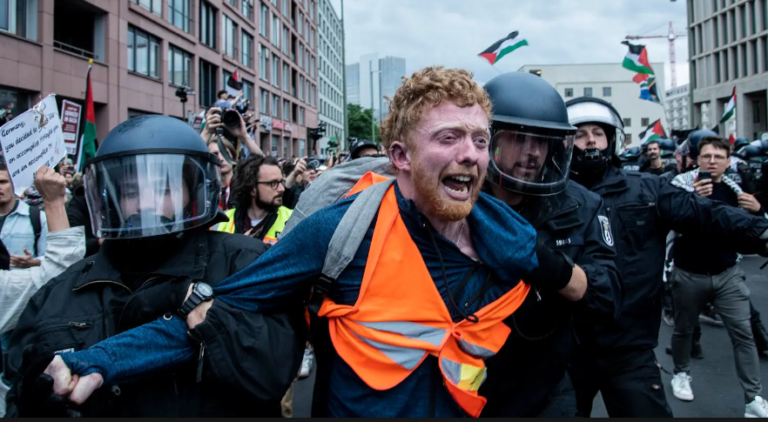 Bhí agóid i mBeirlín Dé Luain i gcoinne díbeartha ceithre agóideoir in aghaidh ionsaithe Iosrael ar na Palaistínigh, beirt acu Éireannaigh.