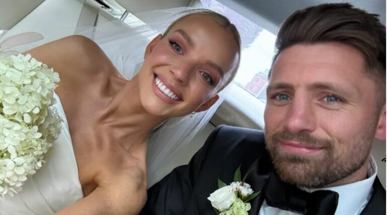 Le go leor pictiúir: B’áilleacht na n-áilleacht í India Healy O’Connor ina gúna ó Oscar de la Renta, dá pósadh leis an réalta rugbaí Ross Byrne