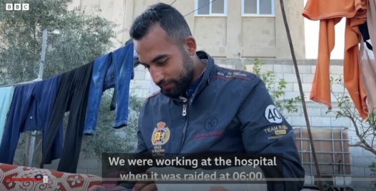 Léiríonn físeán ón BBC ‘medics’ in ospidéal i nGaza ‘stripped’ agus ar a nglúine ar feadh uaireanta